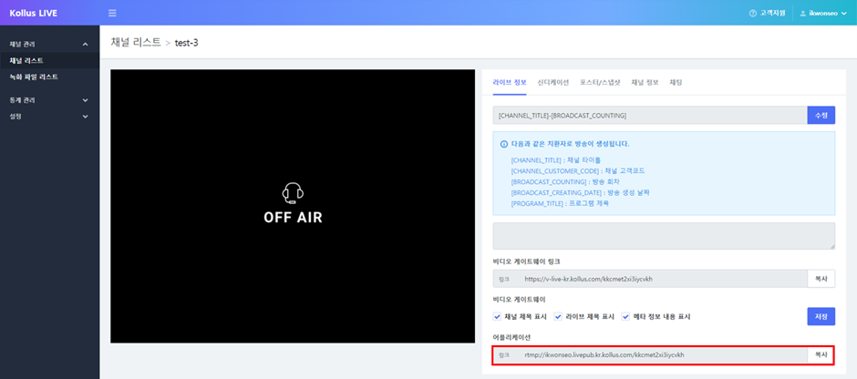 방송을 송출할 주소와 스트림 키는 Kollus Live 콘솔에 접속하여 [채널 관리] > [채널 리스트] > 방송하려는 채널의 상세 페이지 > [라이브 정보] 탭 > [어플리케이션]에서 확인할 수 있습니다.