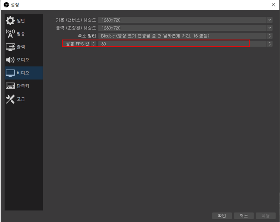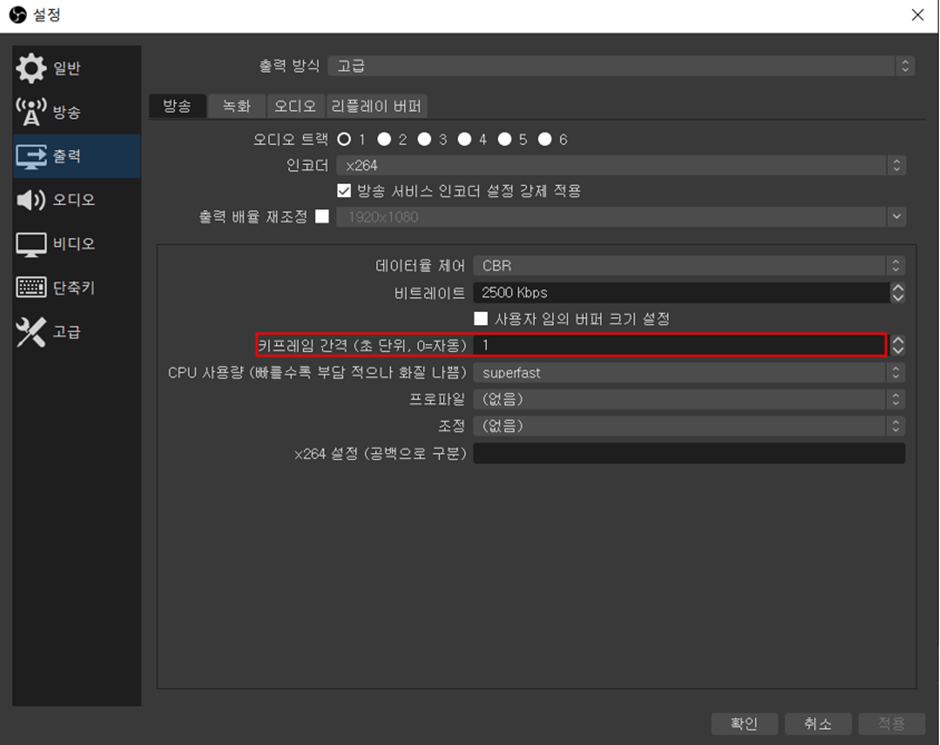 키프레임 간격은 1(초), 공통 FPS 값은 30(fps)을 권장합니다.