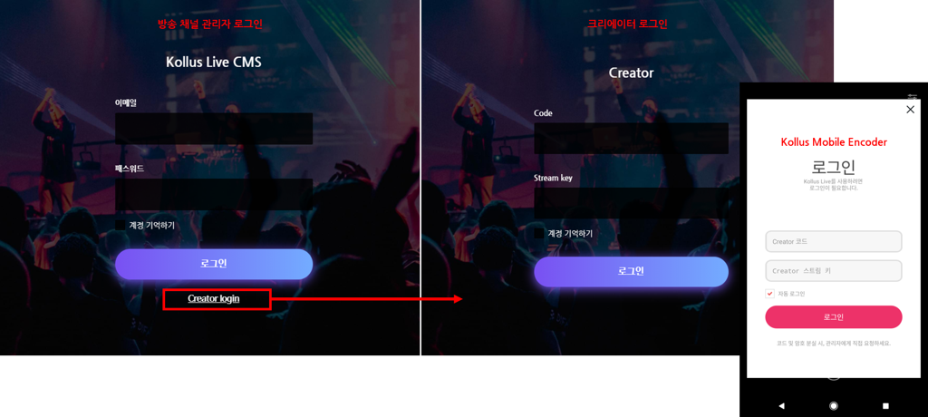 Kollus 라이브의 채널 사용, 혹은 접근 권한은 관리자를 제외하고 기본적으로 세 개의 크리에이터 계정을 생성할 수 있습니다. 단 이 계정은 각 계정에 할당된 방송을 위한 채널 리소스 사용에 한정되어 있으며 관리자 권한을 대행할 수는 없습니다.