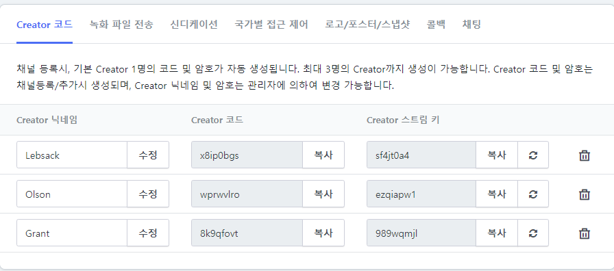 • 한 개의 단일한 '채널'은 1명 이상의 '크리에이터(creator)'가 활용하여 방송을 진행할 수 있습니다. 방송자의 수는 최대 3명이며 각 방송자는 채널을 소유한 관리자에 의해 '크리에이터 코드(creator code)'와 '스트림키(stream key)' 를 발급받아 사용합니다.
