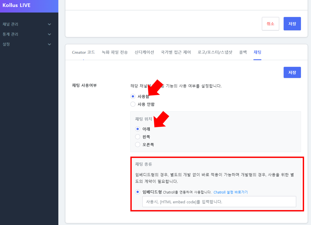 임베디드 코드는 Kollus 라이브 콘솔의 채널 설정 항목중에서 채팅종류 아래에 저장하게 됩니다.