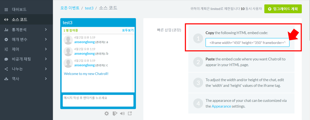 임베디드 코드는 챗롤 사이트 접속후 https://chatroll.com/ 생성된 채팅방을 선택한후 소스코드를 클릭하면 확인하실수 있습니다.