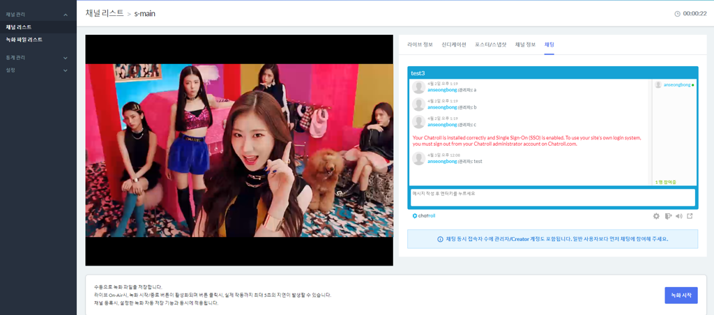 - 채널설정에서 채팅관련한 설정을 하면 채널뷰에서 아래와 같이 채팅창이 표시되게 됩니다