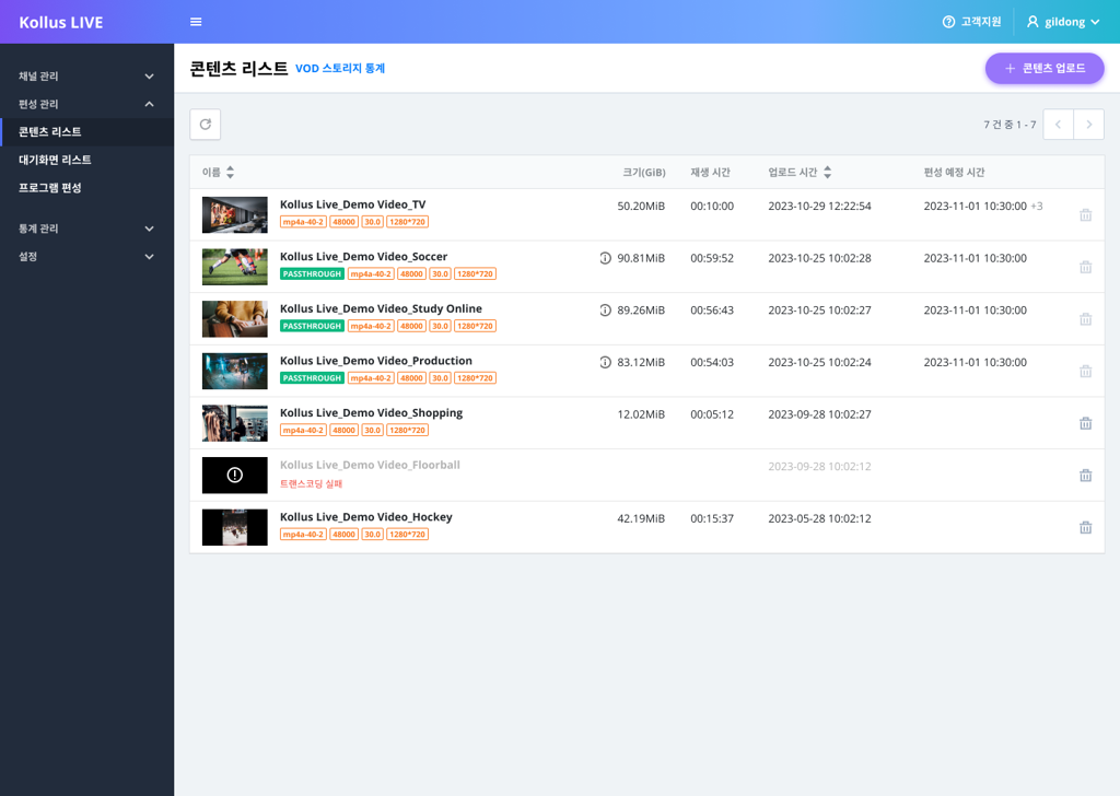 파일라이브 기능이 활성화되면, Kollus Live 콘솔 로그인 시 좌측 메뉴에 편성 관리 항목이 표시됩니다.