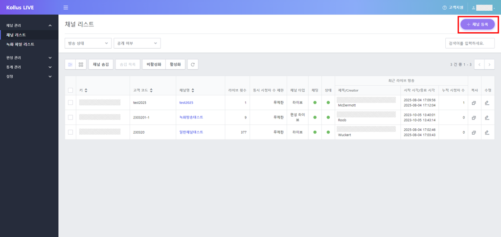 채널 관리 > 채널 리스트 화면 > 채널 등록 버튼