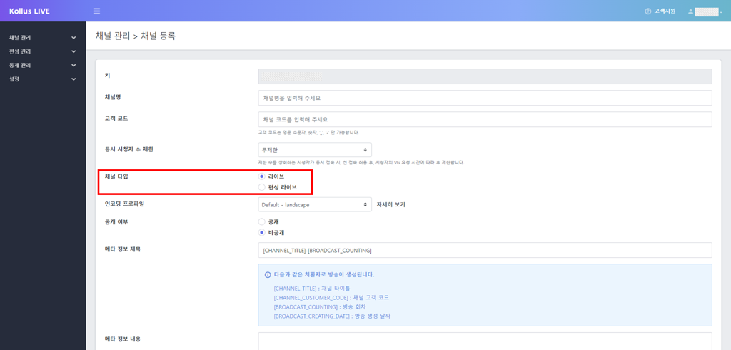 채널 관리 > 채널 등록 화면 > 채널 타입 설정