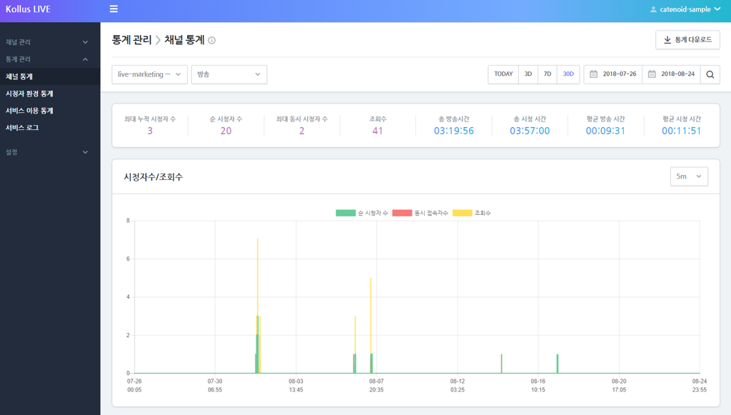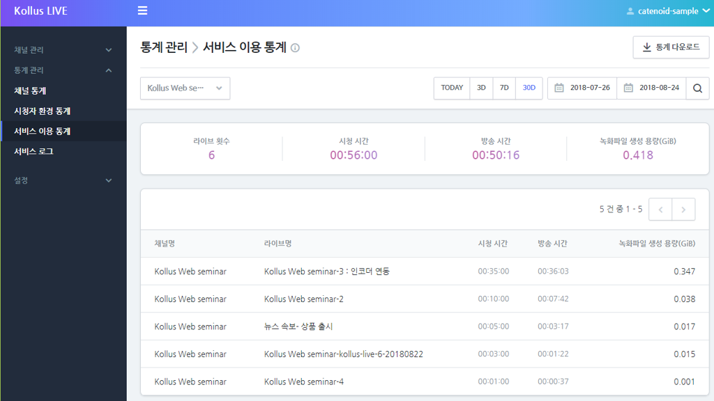 주로 채널별 단위로 활용됩니다. 각 채널에서 방송한 라이브 방송 횟수, 누적 시청 시간 및 방송 시간, 녹화 파일 생성 용량을 요약합니다.