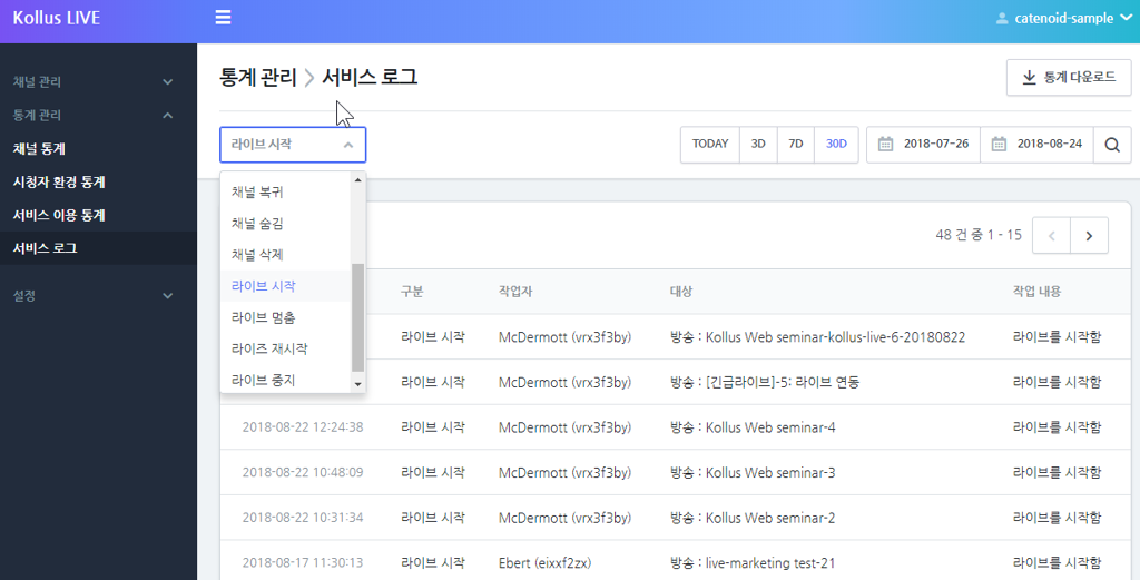 라이브 방송 중 발생한 플랫폼 변경사항 및 작업 내용에 대한 로그데이터를 제공합니다. 해당 기록은 작업 내용에 따라 좌측 상단 메뉴에서 선택하여 조회할 수 있습니다.