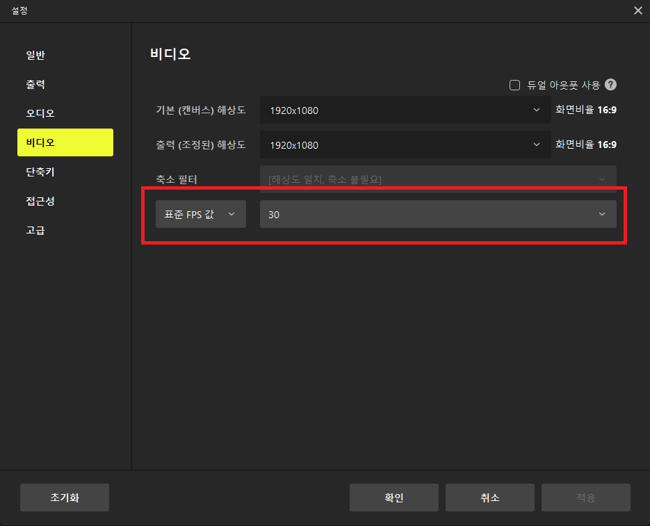 - PRISM Live Studio 설정에서 [출력] > [출력 방식]을 고급, [키프레임 간격]을 1로, [비디오] > [표준 FPS 값]을 30으로 설정합니다.