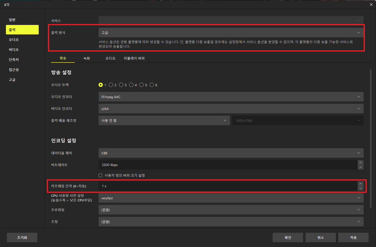 - PRISM Live Studio 설정에서 [출력] > [출력 방식]을 고급, [키프레임 간격]을 1로, [비디오] > [표준 FPS 값]을 30으로 설정합니다.