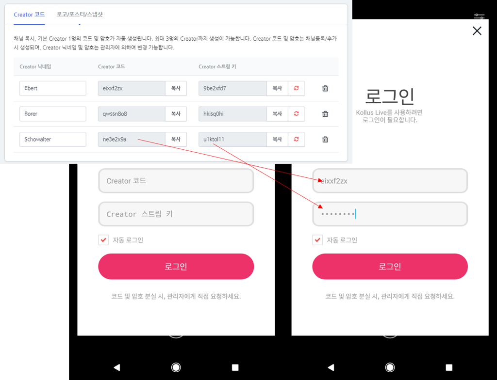 - Kollus 모바일 인코더 사용을 위해서는 Creator 코드와 Creator 스트림 키를 ID/PW처럼 입력해야 합니다.